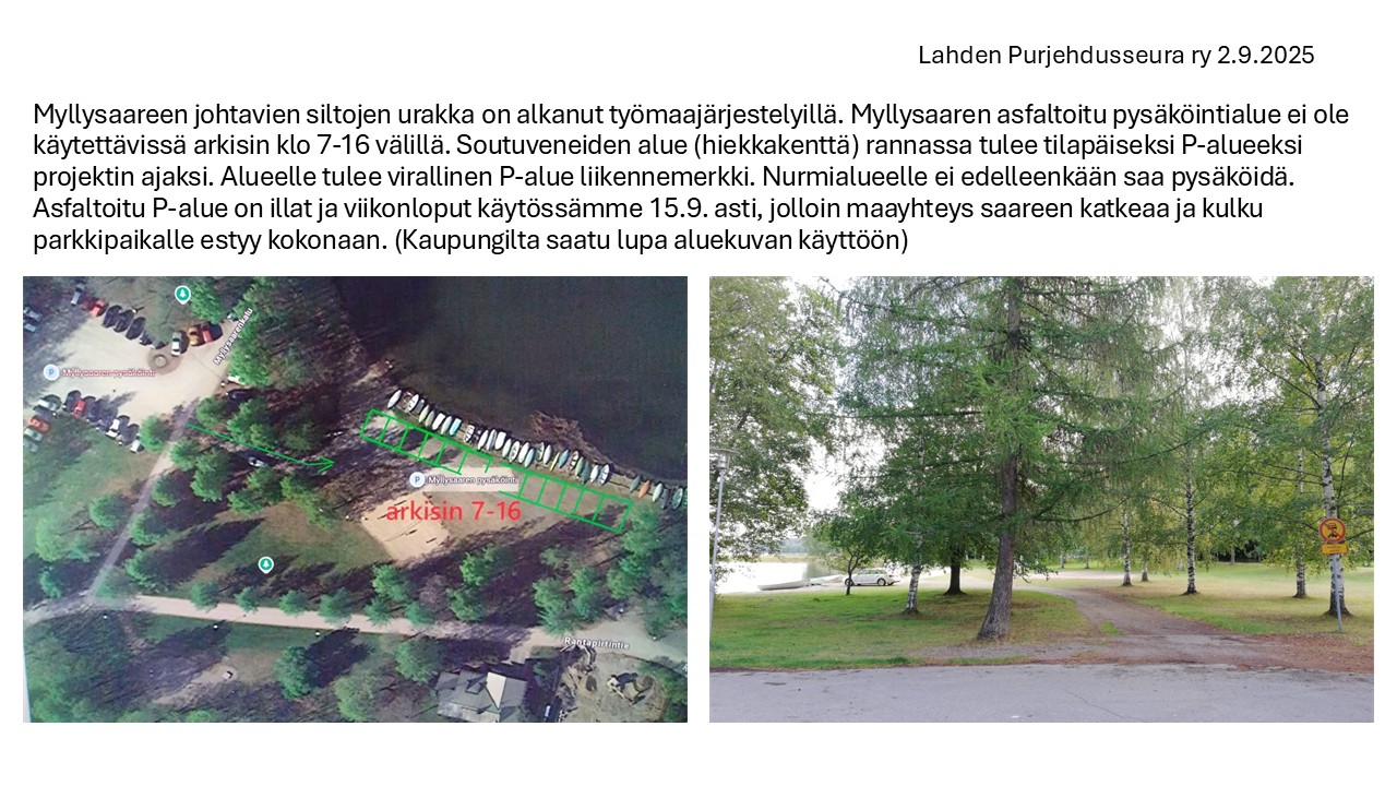 2.9.2025. Myllysaareen johtavien siltojen urakka on alkanut työmaajärjestelyillä. Myllysaaren asfaltoitu pysäköintialue ei ole käytettävissä arkisin klo 7-16 välillä. Soutuveneiden alue (hiekkakenttä) rannassa tulee tilapäiseksi P-alueeksi projektin ajaksi. KATSO KUVA. Alueelle tulee virallinen P-alue liikennemerkki. Nurmialueelle ei edelleenkään saa pysäköidä. Asfaltoitu P-alue on illat ja viikonloput käytössämme 15.9. asti, jolloin maayhteys saareen katkeaa ja kulku parkkipaikalle estyy kokonaan. (Kaupungilta saatu lupa aluekuvan käyttöön)